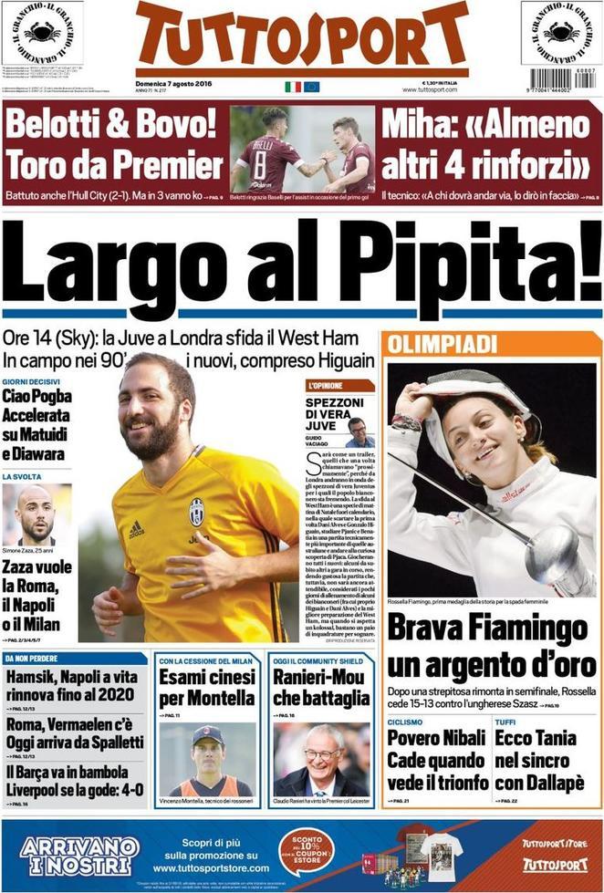 Tuttosport invece debutta con un “Largo ad Higuain” che tanto dice sul potenziale di una Juve che, sul campo, dovrà confermarsi avendo dalla sua tutto il potenziale possibile.