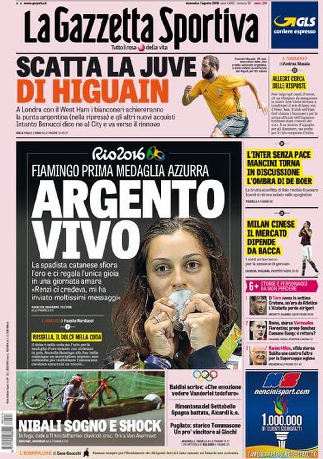 La Gazzetta dello Sport dedica un primo piano a Gonzalo Higuain, che quest’oggi debutterà con la maglia bianconera. Spazio, soprattutto, a Rossella Fiamingo, prima italiana a portare a casa una medaglia, l’argento nella spada, a Rio 2016.