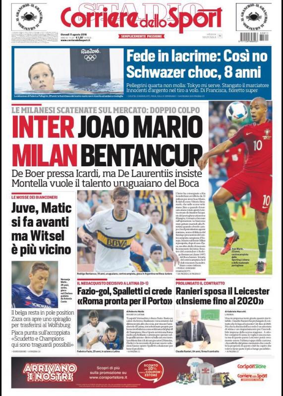 Il Corriere dello Sport: “Inter, Joao Mario. Milan, Bentacur”.