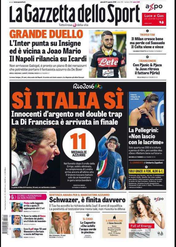La Gazzetta dello Sport: “Grande duello. L’Inter punta su Insigne ed è vicina a Joao Mario. Il Napoli rilancia su Icardi”.