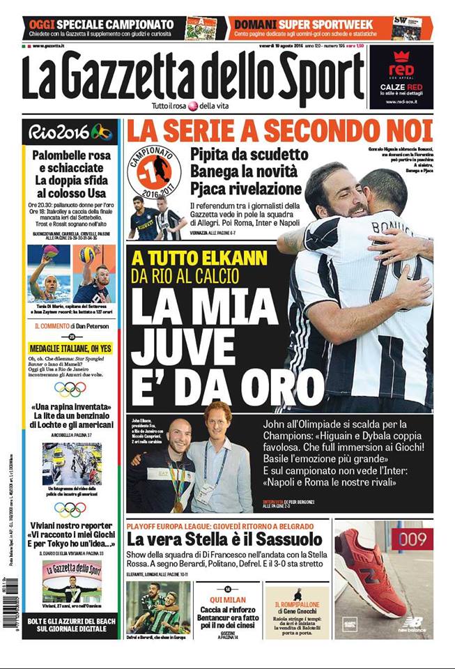 La Gazzetta dello Sport invece propone un’intervista esclusiva a John Elkann, che vede in Napoli ed Inter le principali antagoniste della Juventus per il campionato. Anche qui si esalta la super prestazione del Sassuolo, che ha abbattuto la Stella Rossa per 3-0.