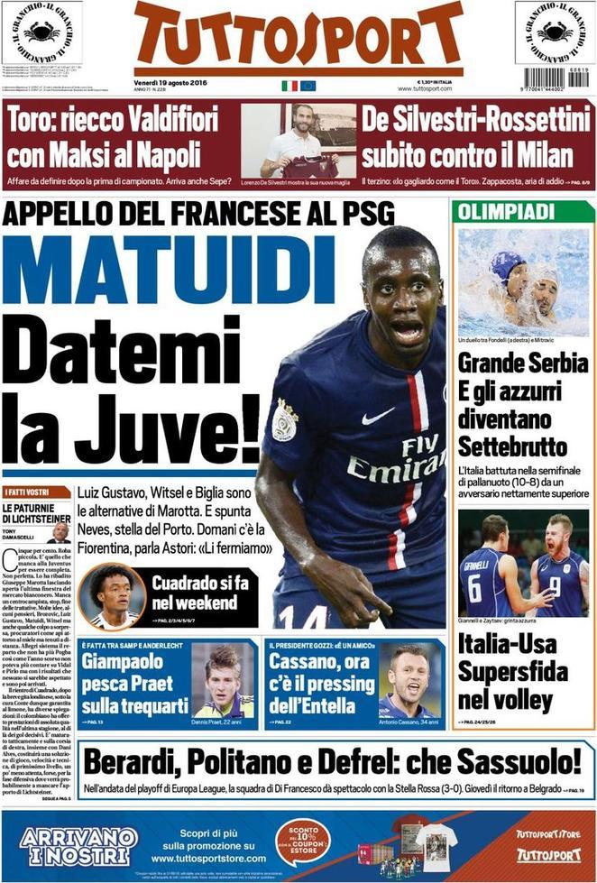 Su Tuttosport invece si analizzano i possibili nomi per il futuro centrocampista della Juventus, in attesa del match d’esordio contro la Fiorentina. In taglio alto si parla di una possibile riapertura per Valdifiori al Torino con Maksimovic diretto invece al Napoli.
