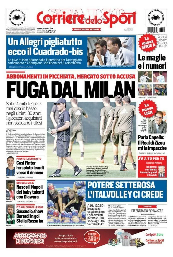 Sono online le prime pagine dei quotidiani sportivi. Il Corriere dello Sport si sofferma sulla difficile situazione in casa Milan, che vede il numero degli abbonamenti colare a picco in seguito ad una campagna acquisti ritenuta non soddisfacente dai tifosi. Spazio anche al Sassuolo corsaro in Europa League, ad ormai un passo dal raggiungere i gironi della competizione.