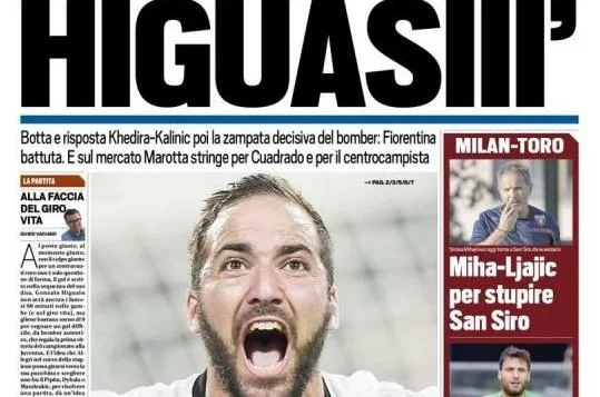 La Serie A è finalmente ricominciata. Roma e Juventus aprono alla grande vincendo i propri match: i bianconeri battono la Fiorentina nel segno di Higuain, che domina quindi le prime pagine dei tre quotidiani sportivi.