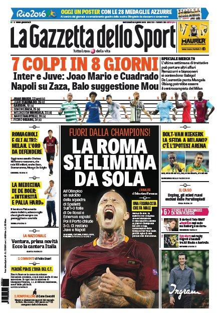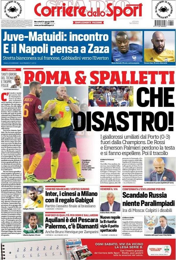 Le prime pagine dei principali quotidiani sportivi nazionali, com’era piuttosto prevedibile, si concentrano prevalentemente sull’eliminazione dalla Champions League della Roma di Spalletti, sconfitta dal Porto per il risultato di 0-3.