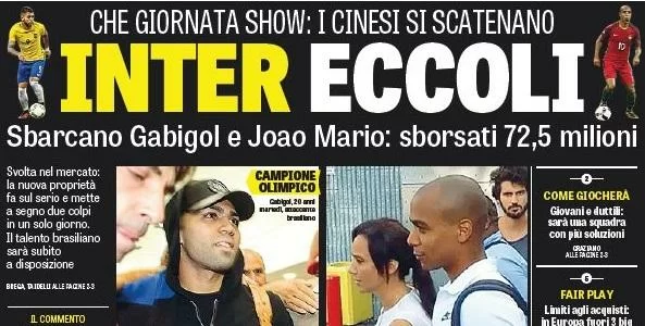 La prima pagina della Gazzetta dello Sport apre con “Inter Eccoli”, a seguito dell’importante operazione di mercato messa a segno dall’Inter con gli acquisti di Gabigol e Joao Mario. Spazio per Juve e Napoli che giocheranno il sabato rispettivamente alle 18:00 e alle 20:45 e per il giovane Donnarumma che sarà convocato dal ct Ventura per la nazionale.