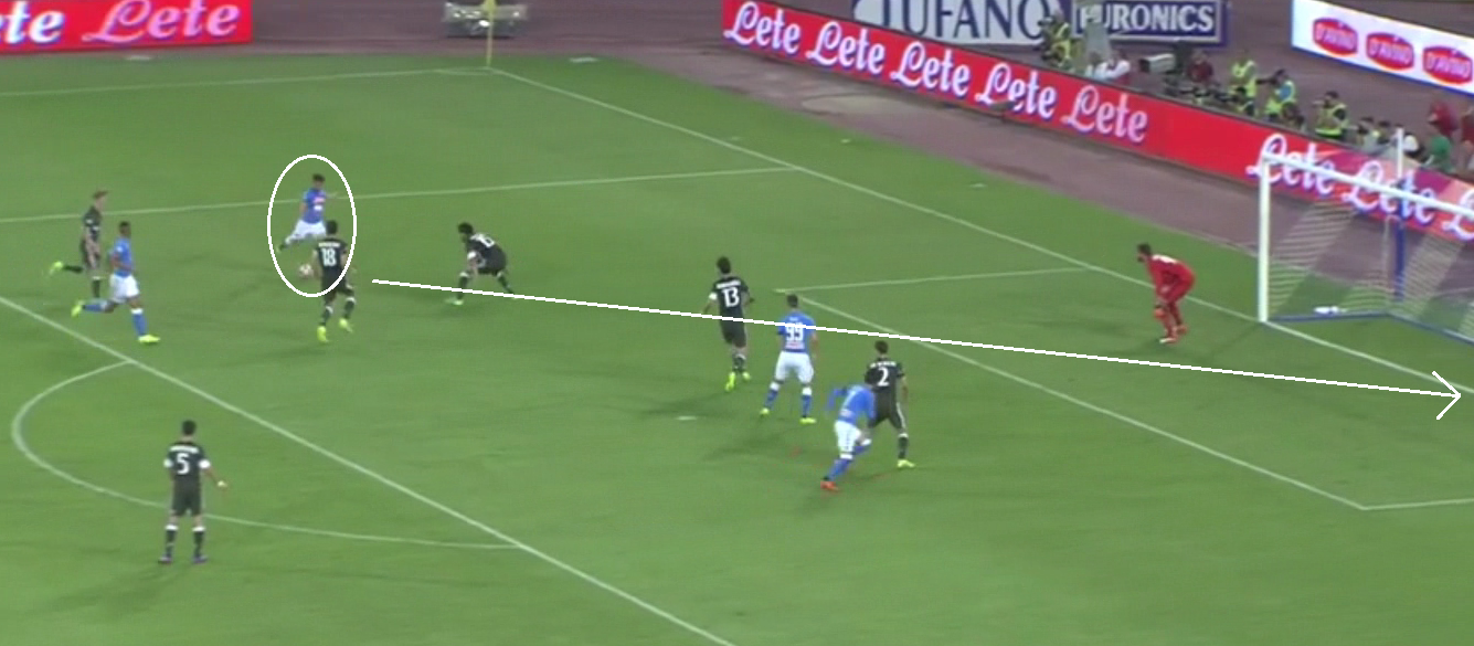 Ghoulam (cerchio bianco) scarica per Hamsik (cerchio azzurro) che di prima innesca Insigne (cerchio giallo) già partito (freccia gialla) ad attaccare Calabria alle spalle