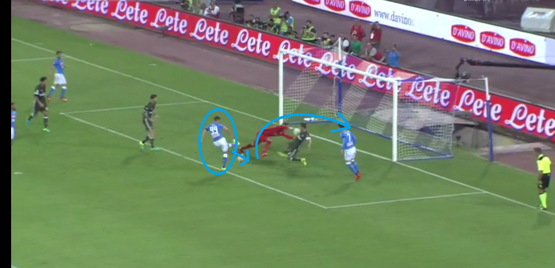 GOAL DEL NAPOLI: Callejon (cerchio azzurro) deve semplicemente appoggiare (freccia azzurra) la palla in rete dopo il mezzo pasticcio di Romagnoli che prima salva il risultato e poi quasi spinge il pallone in rete, salvandosi con un fallo di mano sanzionato da Valeri con il giallo