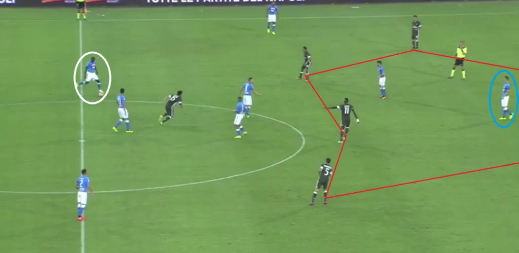 Primo aspetto da sottolineare: palla a Koulibaly (cerchio bianco), Milik (cerchio azzurro) si muove in verticale tra centrocampo e difesa del Milan (linee rosse) in modo da poter ricevere l’imbucata del centrale senegalese