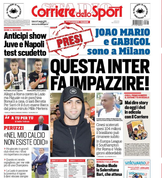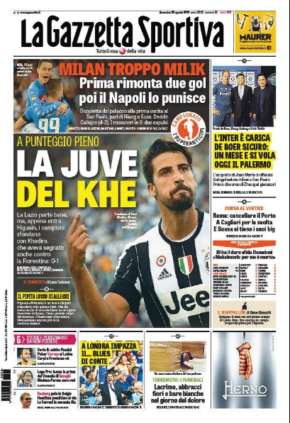 Il Napoli batte il Milan e risponde alla vittoria della Juventus conquistata in casa della Lazio, lasciando inalterato il ritardo di due punti dai bianconeri. I maggiori quotidiani sportivi, intanto, titolano proprio sulla sfida scudetto a distanza tra partenopei e Juventus. Per il Corriere dello Sport, i due anticipi sono già test scudetto. Per la Gazzetta dello Sport, Milik è troppo per il Milan di Montella, mentre la Juve si affida ancora a Khedira. In conclusione, Tuttosport, che parla della vittoria del Napoli ottenuta con la paura di un possibile nuovo passo falso.