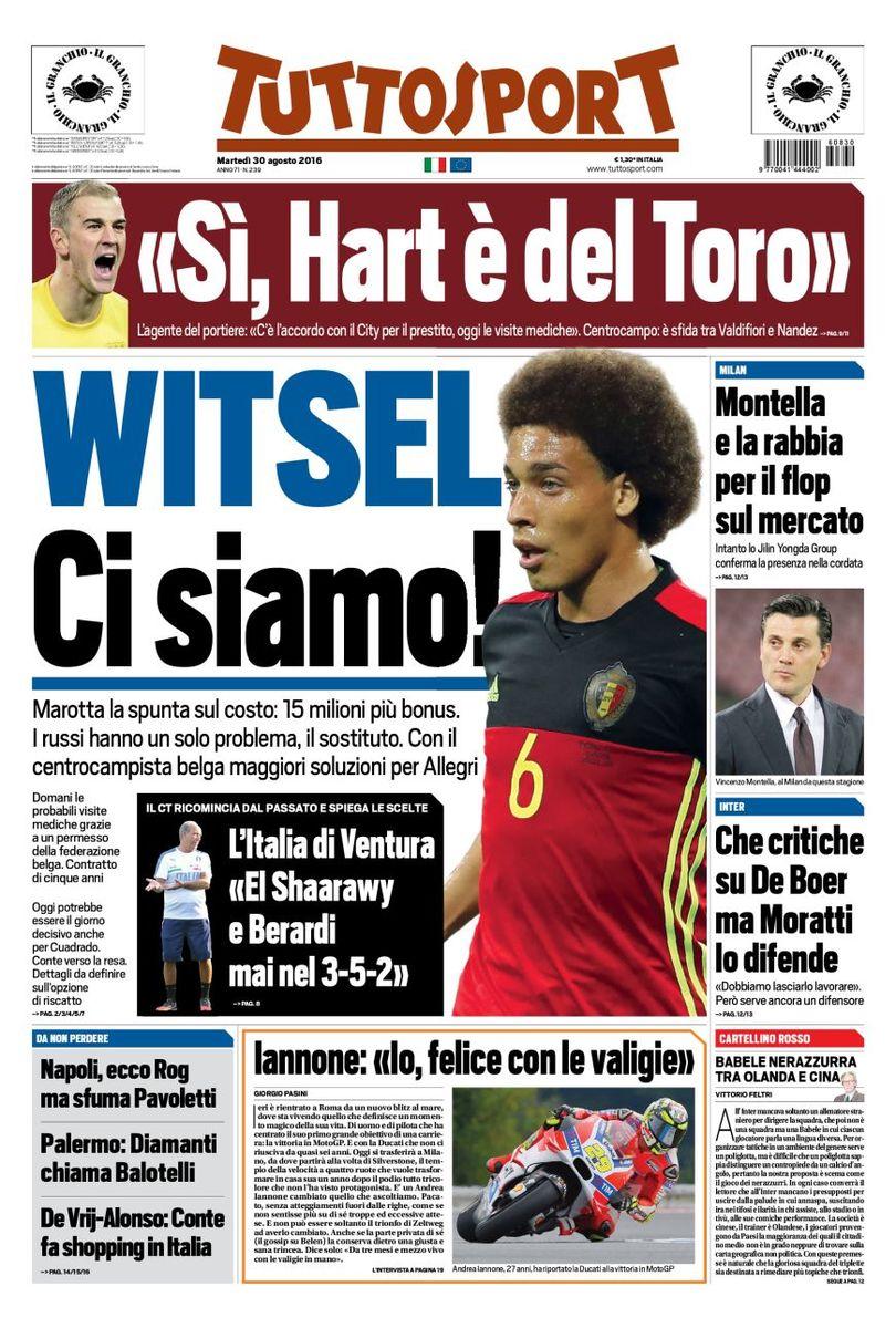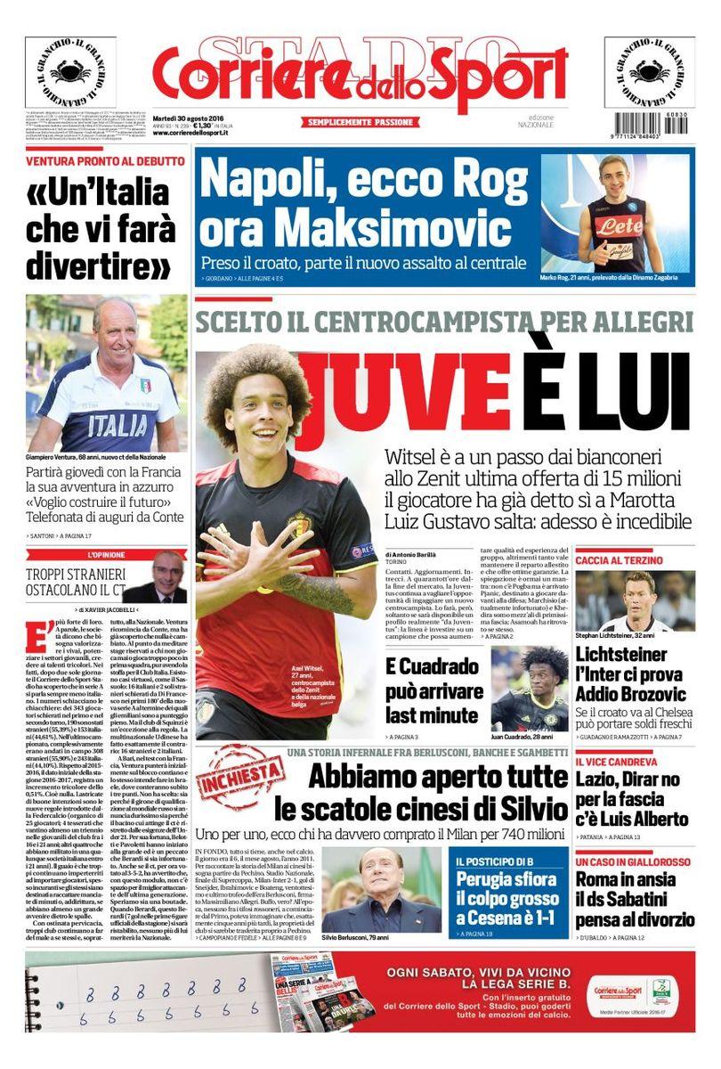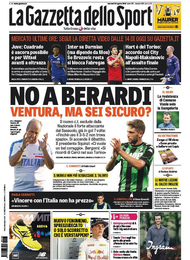 Le prime pagine dei quotidiani sportivi in edicola oggi mettono in risalto la nuova Nazionale Italiana di Giampiero Ventura, con le parole del neo CT sul modulo 3-5-2 da lui prediletto e i giocatori in grado di ricoprire al meglio i rispettivi ruoli. Spazio anche al mercato: per La Gazzetta dello Sport il Napoli si prepara all’assalto decisivo per acquistare Nikola Maksimovic dal Torino, mentre Gabbiadini avrebbe accettato la destinazione Everton. Su Tuttosport, invece, il Torino tiene viva, dopo aver ormai preso Hart dal Manchester City, la pista che porta a Mirko Valdifiori; l’alternativa al giocatore partenopeo sarebbe Nandez del Penarol. Anche il Corriere dello Sport evidenzia come gli azzurri siano pronti alla sterzata finale per portare all’ombra del Vesuvio il difensore serbo.