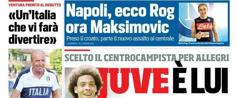 Le prime pagine dei quotidiani sportivi in edicola oggi mettono in risalto la nuova Nazionale Italiana di Giampiero Ventura, con le parole del neo CT sul modulo 3-5-2 da lui prediletto e i giocatori in grado di ricoprire al meglio i rispettivi ruoli. Spazio anche al mercato: per La Gazzetta dello Sport il Napoli si prepara all’assalto decisivo per acquistare Nikola Maksimovic dal Torino, mentre Gabbiadini avrebbe accettato la destinazione Everton. Su Tuttosport, invece, il Torino tiene viva, dopo aver ormai preso Hart dal Manchester City, la pista che porta a Mirko Valdifiori; l’alternativa al giocatore partenopeo sarebbe Nandez del Penarol. Anche il Corriere dello Sport evidenzia come gli azzurri siano pronti alla sterzata finale per portare all’ombra del Vesuvio il difensore serbo.