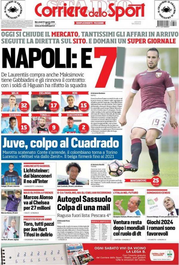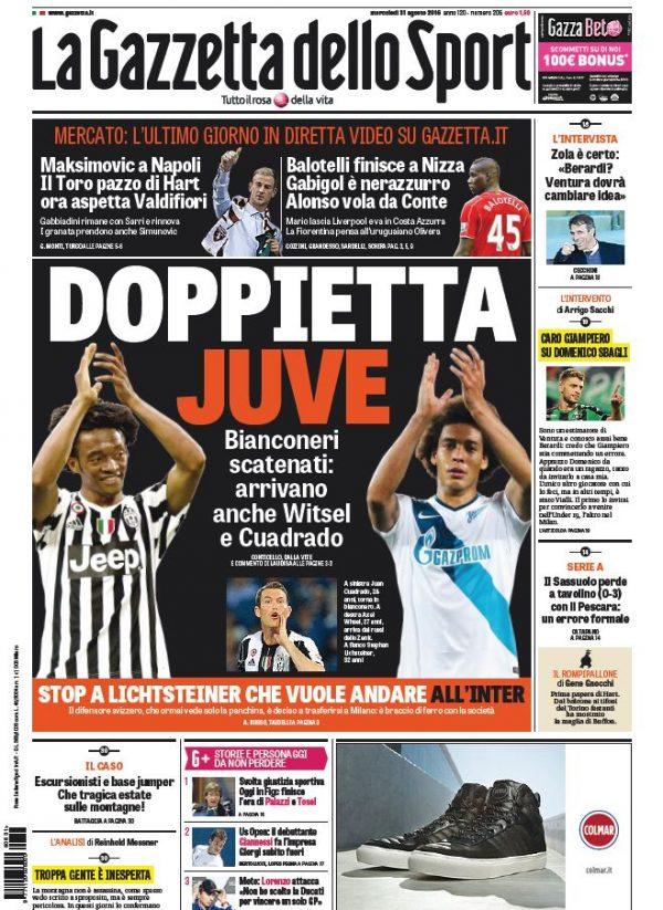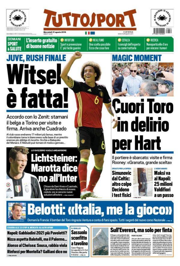 Il Corriere dello Sport celebra l’acquisto di Axel Witsel da parte della Juventus come rinforzo finale per rimpiazzare Pogba ceduto al Manchester United. Tuttosport si concentra in particolare in casa del Torino, l’acquisto di Joe Hart dal Manchester City rappresenta un colpo sensazionale per i granata. In prima pagina anche la convocazione di Belotti in nazionale, Ventura lo ha “promosso” e ora vuole giocarsi le sue chance. Infine la Gazzetta dello Sport oltre a sottolineare il doppio acquisto della Juventus (Witsel e Cuadrado) da spazio all’acquisto di Maksimovic da parte del Napoli e la cessione di Balotelli al Nizza.