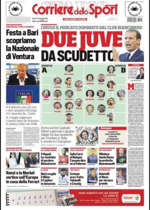 Chiudiamo infine con Il Corriere dello Sport, che in primo piano schiera su un campo ben due formazioni della Juventus, simboleggiando la potenza della formazione bianconera in questa sessione di mercato. A lato si parla anche di Ventura, neo-tecnico dell’Italia, pronto a fare il suo esordio contro la Francia.