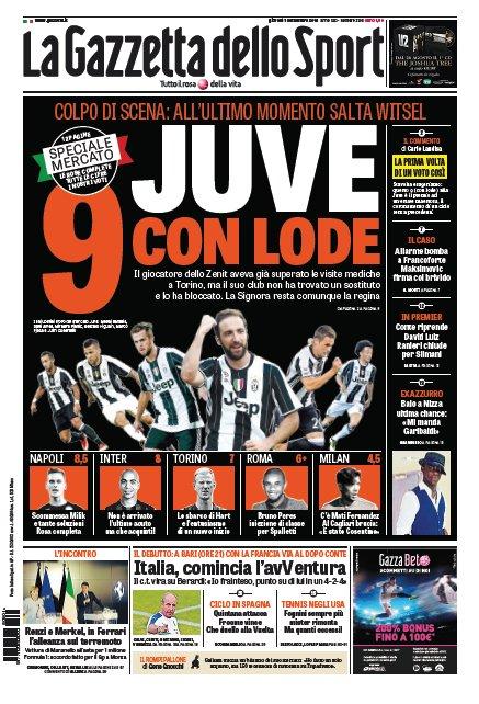 Il quotidiano rosa La Gazzetta dello Sport dà i voti a quello che è stato il mercato estivo dei grandi colpi, dando un sontuoso 9 alla Juventus, nonostante il mancato arrivo al fotofinish di Axel Witsel. Al Napoli la rosea assegna comunque un buon 8, sintomo che la partenza di Gonzalo Higuain è stata ben ammortizzata dai partenopei.