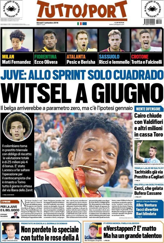 Per quanto concerne Tuttosport, il quotidiano torinese in prima pagina si concentra su quella che è stata la trattativa Witsel, sottolineando soprattutto la delusione per questo affare che è stato sì rimandato, ma che la dirigenza bianconera sperava di chiudere in questa sessione estiva. A lato si parla anche del Torino, con il tecnico Mihajlovic che ha trovato il regista che cercava in Mirko Valdifiori.