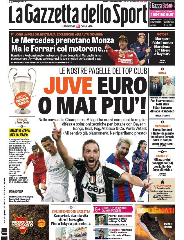 Sui maggiori quotidiani nazionali si fa il punto sul mercato, insieme alle presentazioni dei nuovi acquisti dei club di A, con un focus particolare sulla Juve che punta alla Champions, tra le favorite della competizione per la Gazzetta dello Sport. Tutte le prime in aggiornamento nella nostra consueta Gallery.
