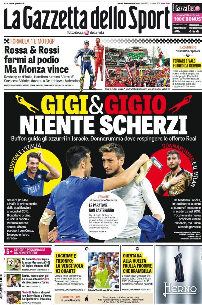 Ecco la photogallery delle prime pagine dei principali quotidiani sportivi nazionali, la Gazzetta dello Sport dedica la prima pagina di due Gigi: Buffon da un lato e Donnarumma dall’altro “Niente scherzi” è il titolo in riferimento del prossimo match della nazionale italiana contro l’Israele.