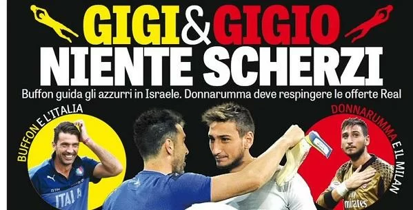 Ecco la photogallery delle prime pagine dei principali quotidiani sportivi nazionali, la Gazzetta dello Sport dedica la prima pagina di due Gigi: Buffon da un lato e Donnarumma dall’altro “Niente scherzi” è il titolo in riferimento del prossimo match della nazionale italiana contro l’Israele.
