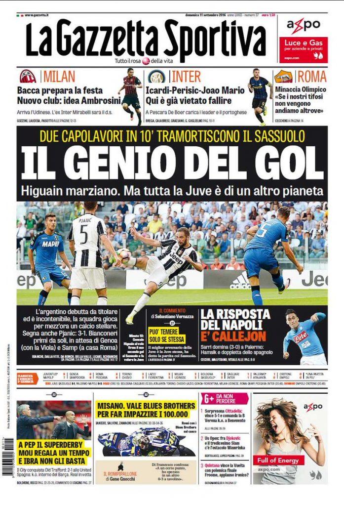 La Gazzetta dello Sport apre con “Juve di un altro pianeta“, guidata dal “Genio del gol“, Gonzalo Higuain. In basso spazio ai partenopei: “La risposta del Napoli è Callejon“.