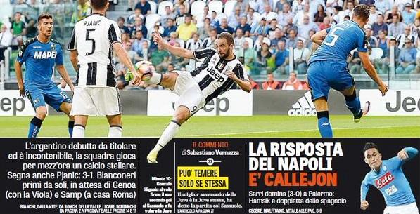 La Gazzetta dello Sport apre con “Juve di un altro pianeta“, guidata dal “Genio del gol“, Gonzalo Higuain. In basso spazio ai partenopei: “La risposta del Napoli è Callejon“.