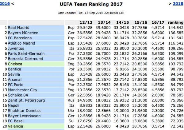Di seguito il grafico del Ranking Uefa delle prime 20 squadre.