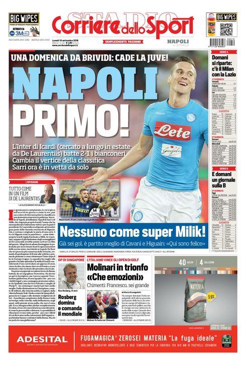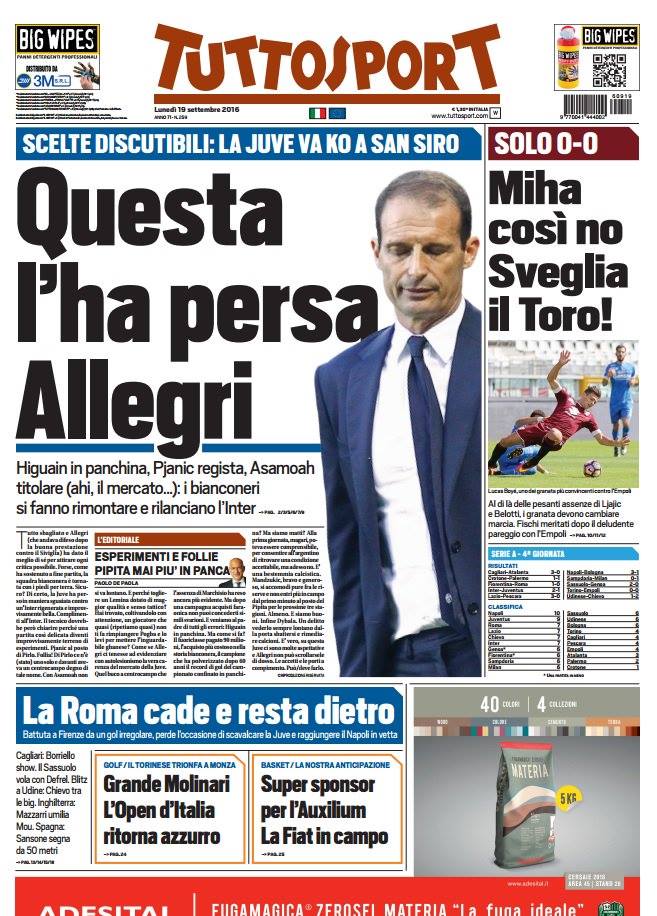 Tuttosport non va leggero sulla sconfitta patita al Meazza dalla Juventus accusando l’allenatore Max Allegri per il 2-1 subito, non aver schierato Higuain dall’inizio e aver inserito Pjanic come regista sono le principali critiche. Il Corriere dello Sport sottolinea il primato solitario del Napoli e concede spazio alla vittoria dell’Inter con un titolo inequivocabile: “L’Inter gode, Napoli primo”.
