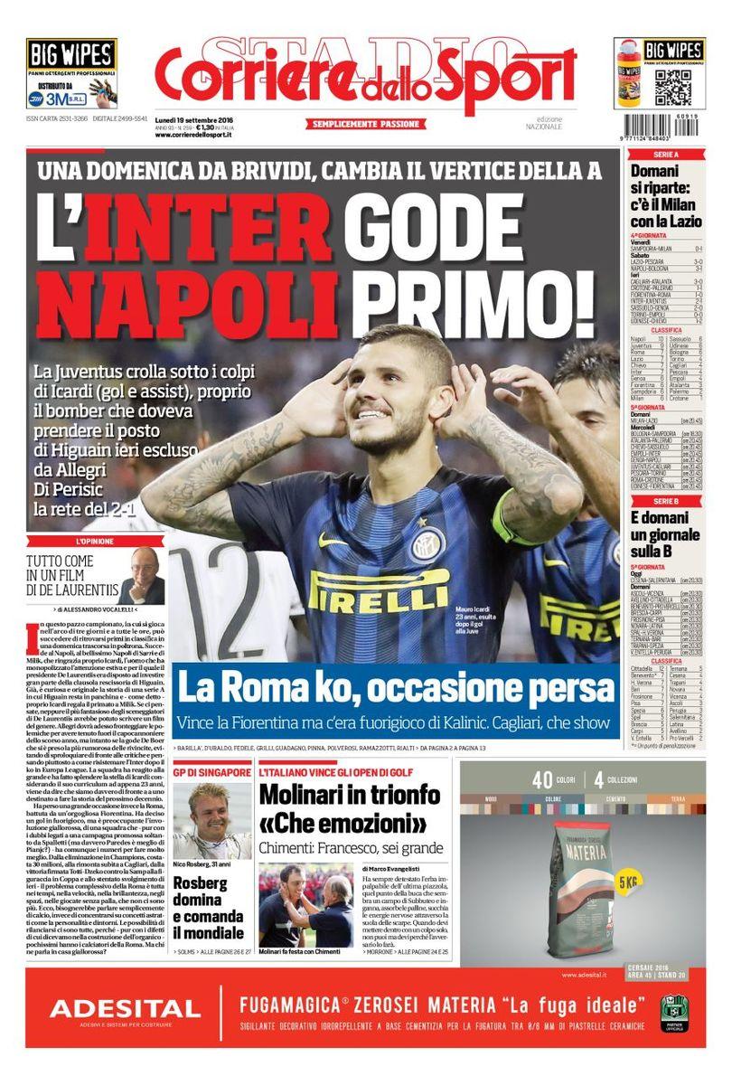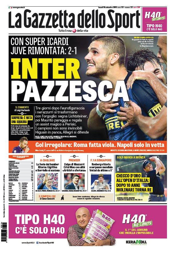 Chiude la Gazzetta dello Sport invece si sofferma sulla vittoria dell’Inter e sulla grande prestazioni di Mauro Icardi al quale dedica l’intera prima pagina titolando: “Inter pazzesca”; solamente a margine la Roma che secondo il quotidiano può recriminare per il goal subito e Napoli.