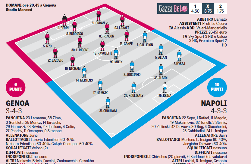 Novità anche in attacco, con Milik che, dopo la doppietta rifilata agli emiliani, dovrebbe scendere in campo dal primo minuto al posto di Gabbiadini, così come Mertens potrebbe completare l’attacco insieme al polacco e a Callejon. Turno di riposo, dunque, per Insigne. Ultimo cambio, Ghoulam al posto di Strinic per la fascia sinistra.