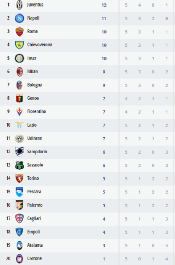 Questa la classifica al termine della quinta giornata: