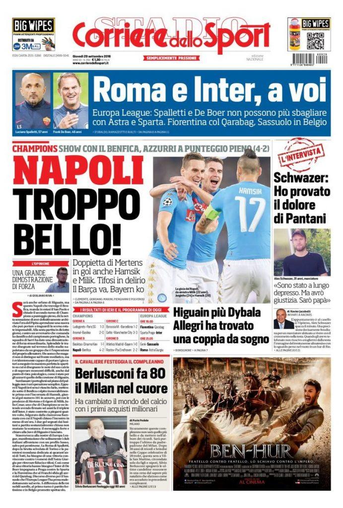 I quotidiani sportivi odierni danno tantissimo risalto alla vittoria del Napoli che in Champions League ha strapazzato il Benfica per 4-2 (SCORRI IN ALTO LE PRIME PAGINE SPORTIVE).