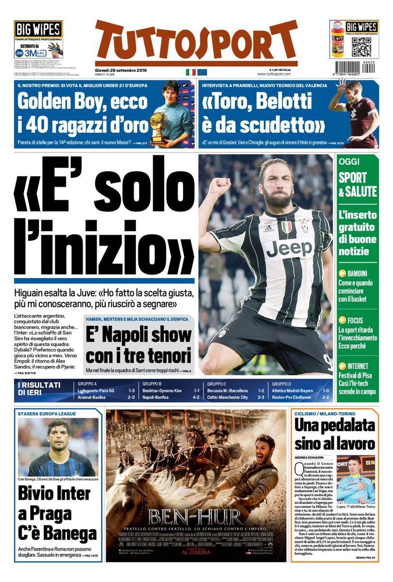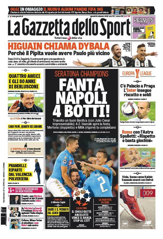 I quotidiani sportivi odierni danno tantissimo risalto alla vittoria del Napoli che in Champions League ha strapazzato il Benfica per 4-2 (SCORRI IN ALTO LE PRIME PAGINE SPORTIVE).
