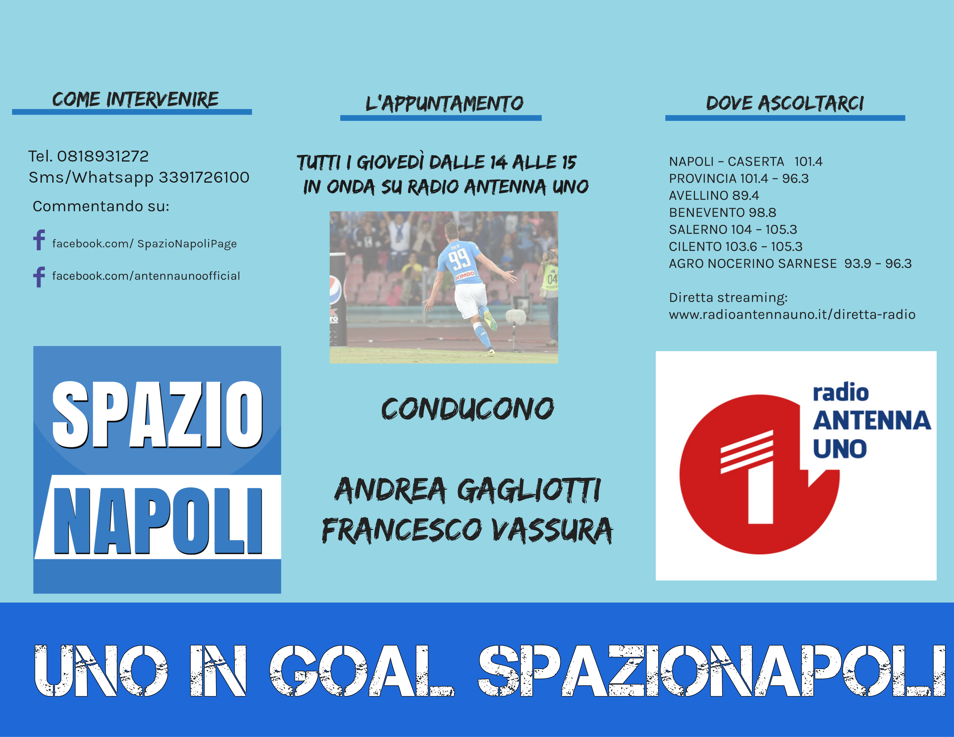 Comincia oggi una nuova avventura: parte infatti il programma radiofonico “Uno in Goal SpazioNapoli”, in onda su Radio Antenna Uno. Dalle 14 alle 15 di ogni giovedì parleremo degli azzurri con tanti ospiti in diretta. Conducono Andrea Gagliotti e Francesco Vassura.
