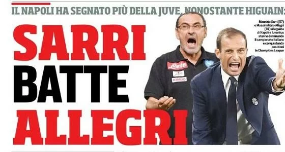 Sul Corriere dello Sport confronto tra Napoli e Juve con il titolo che recita: “Sarri batte Allegri“. Su Tuttosport spazio al film della Juventus (SCORRI IN ALTO LE PRIMA PAGINE SPORTIVE).