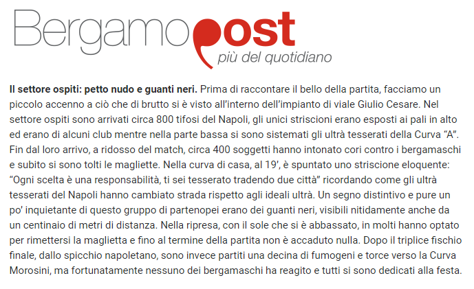 Circa 800 tifosi – si legge all’interno dell’articolo – accorsi allo stadio Atleti Azzurri d’Italia, alcuni dei quali, appartenenti alla “Curva A”, fin dall’ingresso nel settore ospiti hanno intonato cori contro i bergamaschi, togliendosi le magliette.