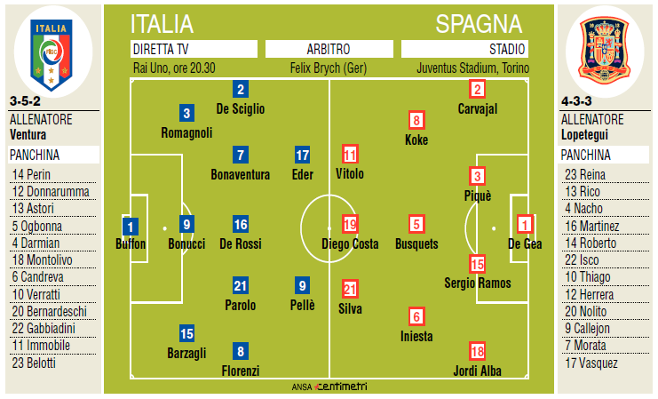 La Spagna di Lopetegui tenterà di vendicare quel 0-2 subito lo scorso 27 giugno in Francia durante gli Europei. Quella Italia, guidata da Conte, mise in costante difficoltà La Roja.