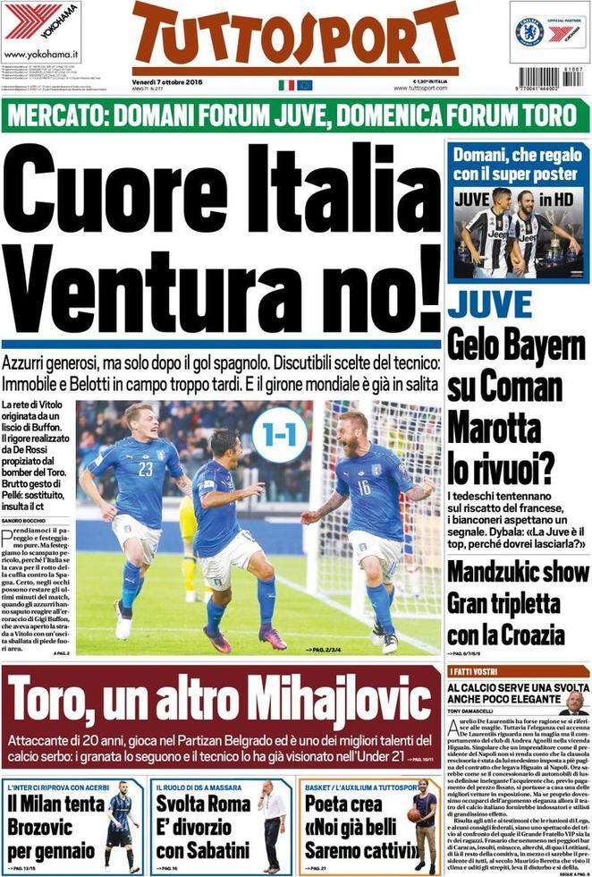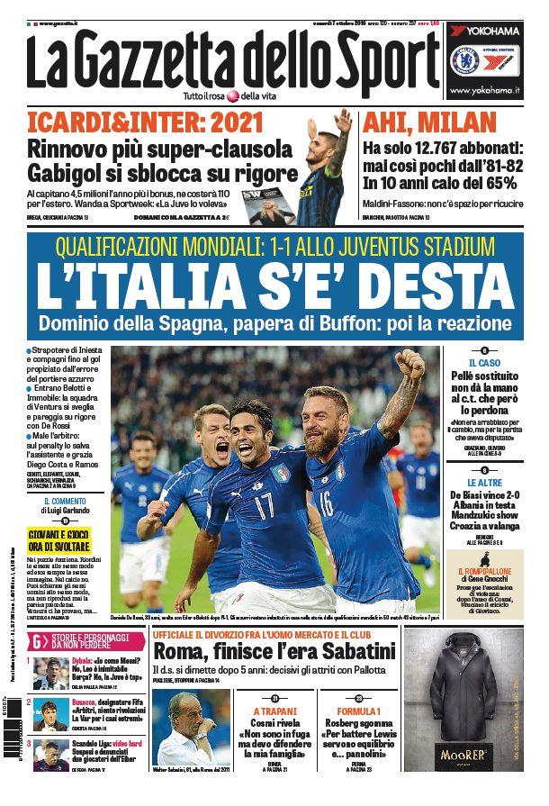 Le prime pagine dei quotidiani sportivi di oggi sono tutte concentrare sulla partita che ha visto l’Italia impattare per 1-1 allo “Juventus Stadium” con la Spagna. Viene esaltata la reazione dopo la rete subita, ma non mancano feroci critiche al CT Ventura per l’atteggiamento della squadra.
