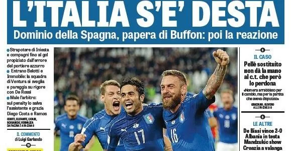 Le prime pagine dei quotidiani sportivi di oggi sono tutte concentrare sulla partita che ha visto l’Italia impattare per 1-1 allo “Juventus Stadium” con la Spagna. Viene esaltata la reazione dopo la rete subita, ma non mancano feroci critiche al CT Ventura per l’atteggiamento della squadra.
