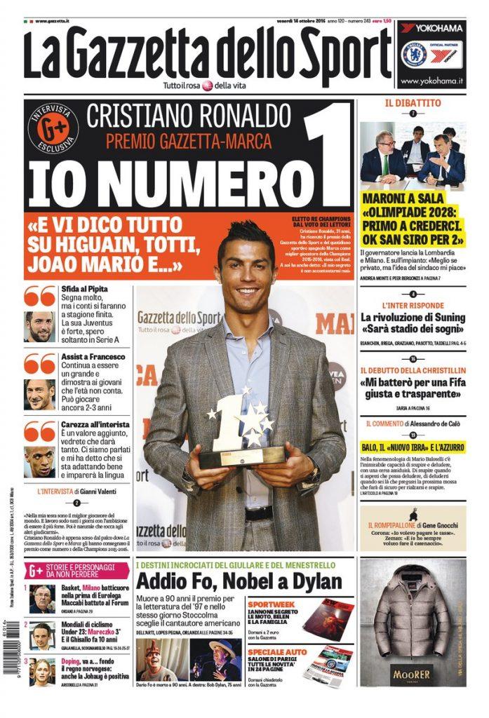 Intervista al campione portoghese del Real Madrid, Cristiano Ronaldo, sulla prima pagina della Gazzetta dello Sport. Il Corriere dello Sport risponde con un’intervista realizzata da Walter Veltroni a Massimiliano Allegri. Su Tuttosport anticipazione sulla formazione della Juve che contro l’Udinese giocherà con Mandzukic in attacco.
