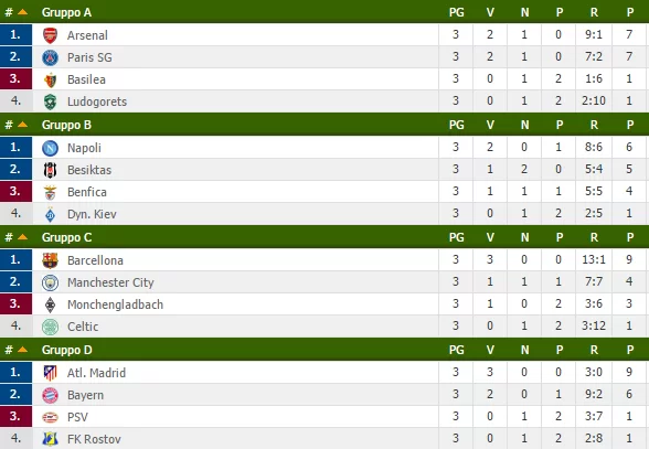 Nel gruppo D torna a vincere Ancelotti col suo Bayern Monaco: quattro a uno contro i campioni d’Olanda del PSV. Vince anche l’Atletico Madrid per 0-1, di misura, sul campo del Rostov.