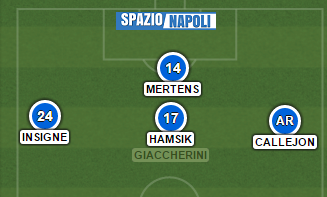 IL 4-2-3-1 – Ulteriore possibilità è il cambio modulo con due mediani, il trequartista (Hamsik o Giaccherini), i due esterni e la punta centrale (Mertens). Soluzione più difficile dal primo minuto, ma utilizzabile in certe fasi della partita.