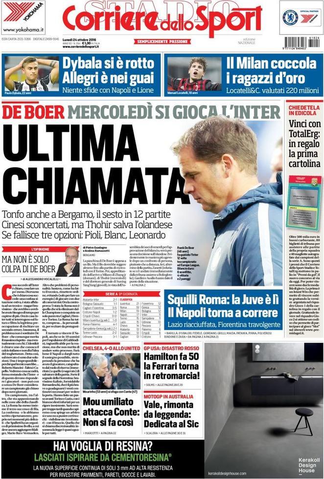 Sul Corriere dello Sport si parla di ultimatum per De Boer: Thohir ha confermato il tecnico olandese che però mercoledì deve battere il Torino per conservare la panchina. In taglio alto l’allarme per la Juve: “Dybala si è rotto“.