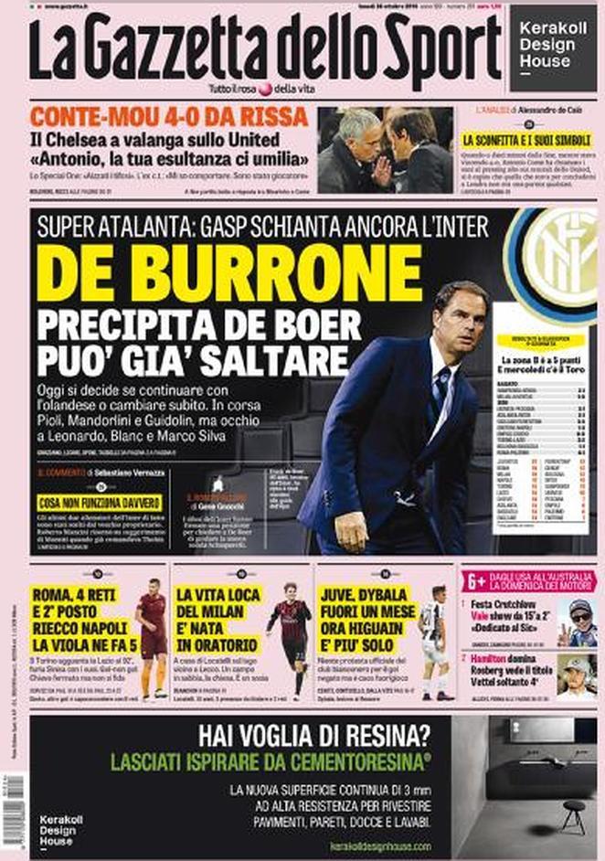 La Gazzetta dello Sport invece dedica un eloquente titolo alla nuova sconfitta dell’Inter che sembra determinare una rottura insanabile tra squadra e allenatore: “De Burrone. Precipita De Boer può gia saltare“, in taglio basso invece riferimenti alle vittorie di Roma e Milan.