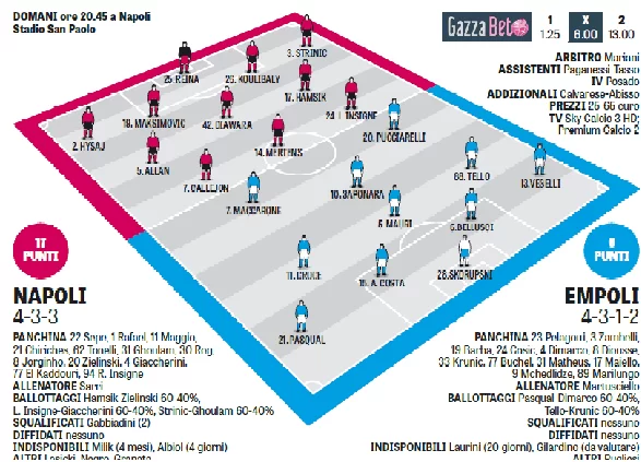 Ecco perché il tecnico azzurro contro l’Empoli non cambierà praticamente quasi nulla, così come riportato dall’edizione odierna della Gazzetta dello Sport, proprio per dare una certa continuità al gruppo. Confermati, quindi, Strinic e soprattutto Diawara. Al centro della difesa ancora assente Albiol, con Maksimovic e Koulibaly in campo dal primo minuto. In attacco, Insigne prenderà il posto dello squalificato Gabbiadini.
