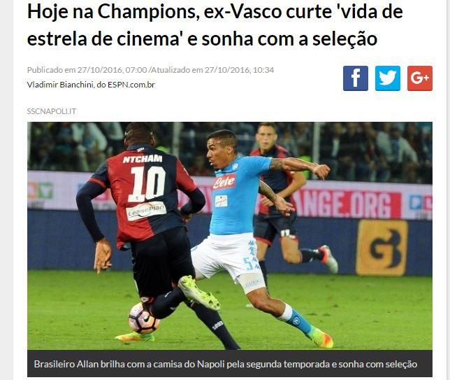 Ai microfoni di ESPN è intervenuto il centrocampista del Napoli Allan Marques che si è raccontato in esclusiva alla sezione brasiliana della famosa emittente internazionale, il brasiliano ha parlato della sua vita con la casacca partenopea e della sua esperienza con la nazionale nell’Under 20 dove conquistò l’oro nel 2011, ecco un estratto dell’intervista:
