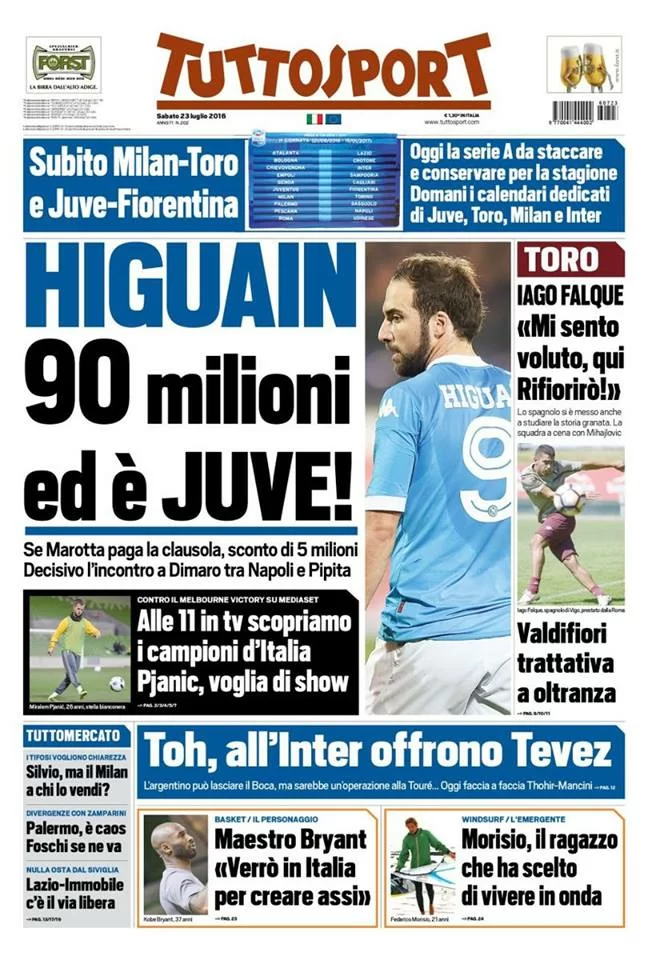 L'edizione odierna di Tuttosport apre con la possibilità della Juventus di ricevere sconti nella trattativa per Gonzalo Higuain: decisivo l'incontro tra l'entourage del Pipita e De Laurentiis a Dimaro. Spazio anche alla trattativa per Valdifiori al Torino