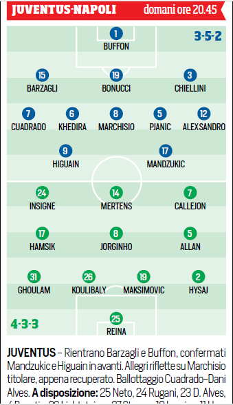 Archiviate le pratiche Crotone ed Empoli con un ampio turn over, il Napoli si prepara alla grande sfida dello Juventus Stadium contro la capolista. Sarri, avendo fatto ruotare un po’ tutti tra Empoli e Crotone, si ritrova una squadra “riposata” ma in forma-partita.