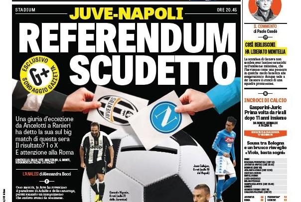 È ormai tempo di Juventus-Napoli, in programma questa sera allo Stadium. Ne parlano al bar, per strada, sui social, nelle radio ed in tv, così come i maggiori quotidiani sportivi.