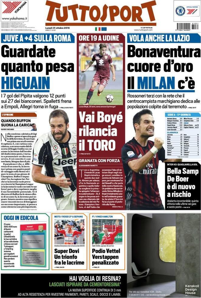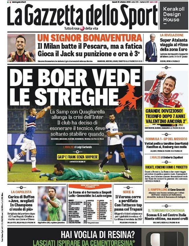 Le prime pagine dei quotidiani sportivi italiani, come è normale che sia, dedicano spazio soprattutto ai temi del campionato, con la Juventus in fuga, i rallentamenti di Napoli e Roma, ed infine sul possibile esonero di De Boero dopo l’ennesima sconfitta dell’Inter.
