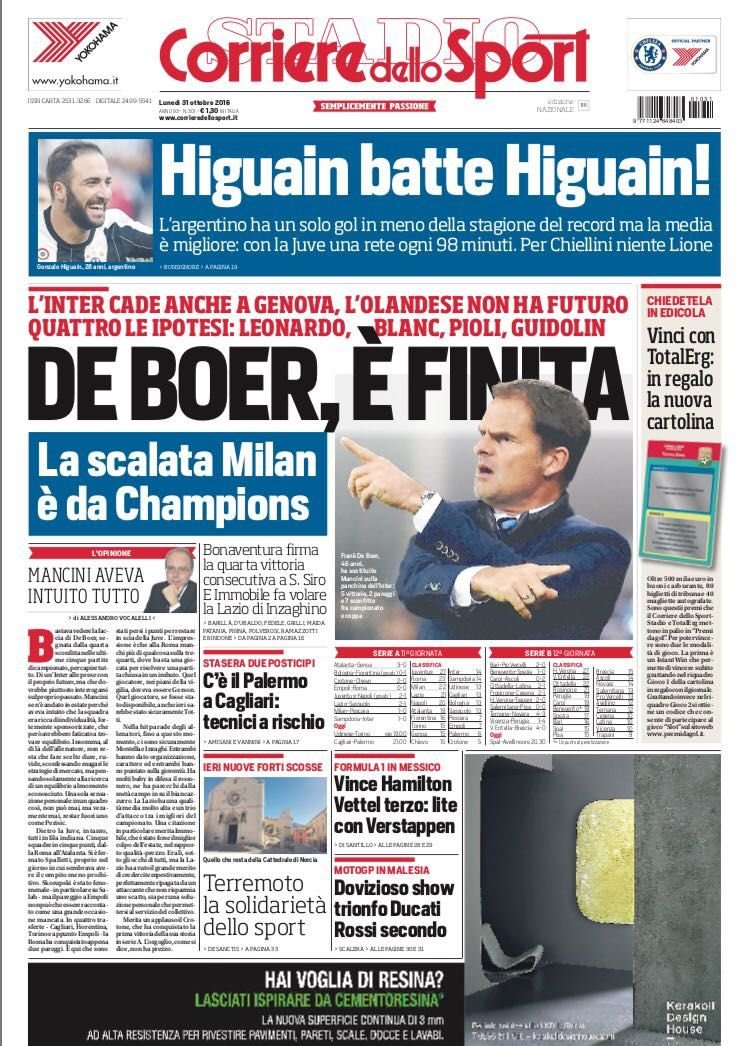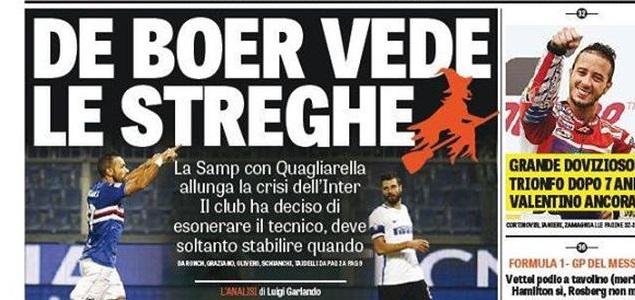 Le prime pagine dei quotidiani sportivi italiani, come è normale che sia, dedicano spazio soprattutto ai temi del campionato, con la Juventus in fuga, i rallentamenti di Napoli e Roma, ed infine sul possibile esonero di De Boero dopo l’ennesima sconfitta dell’Inter.